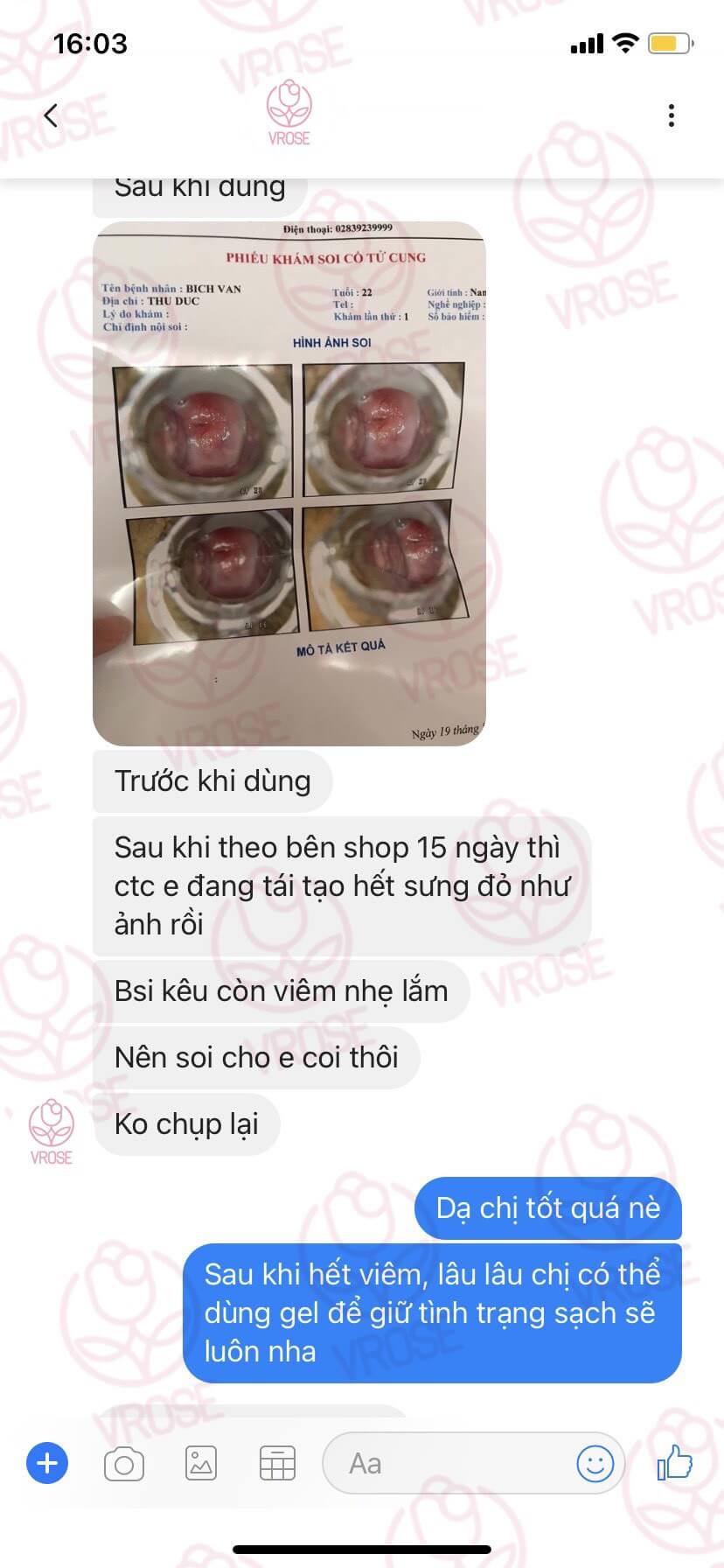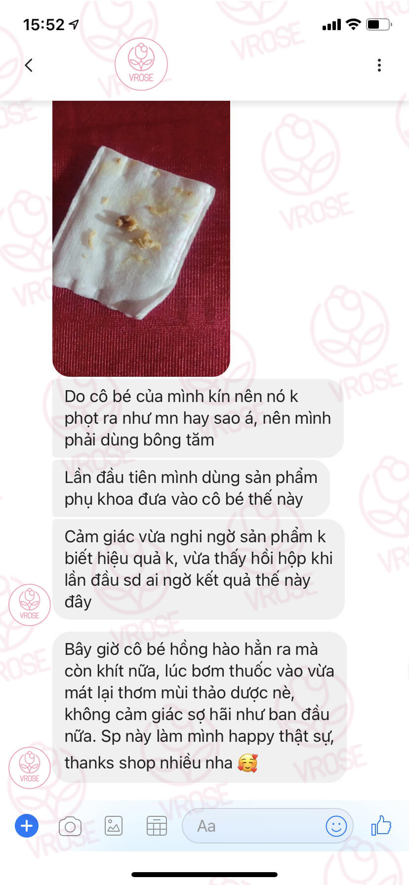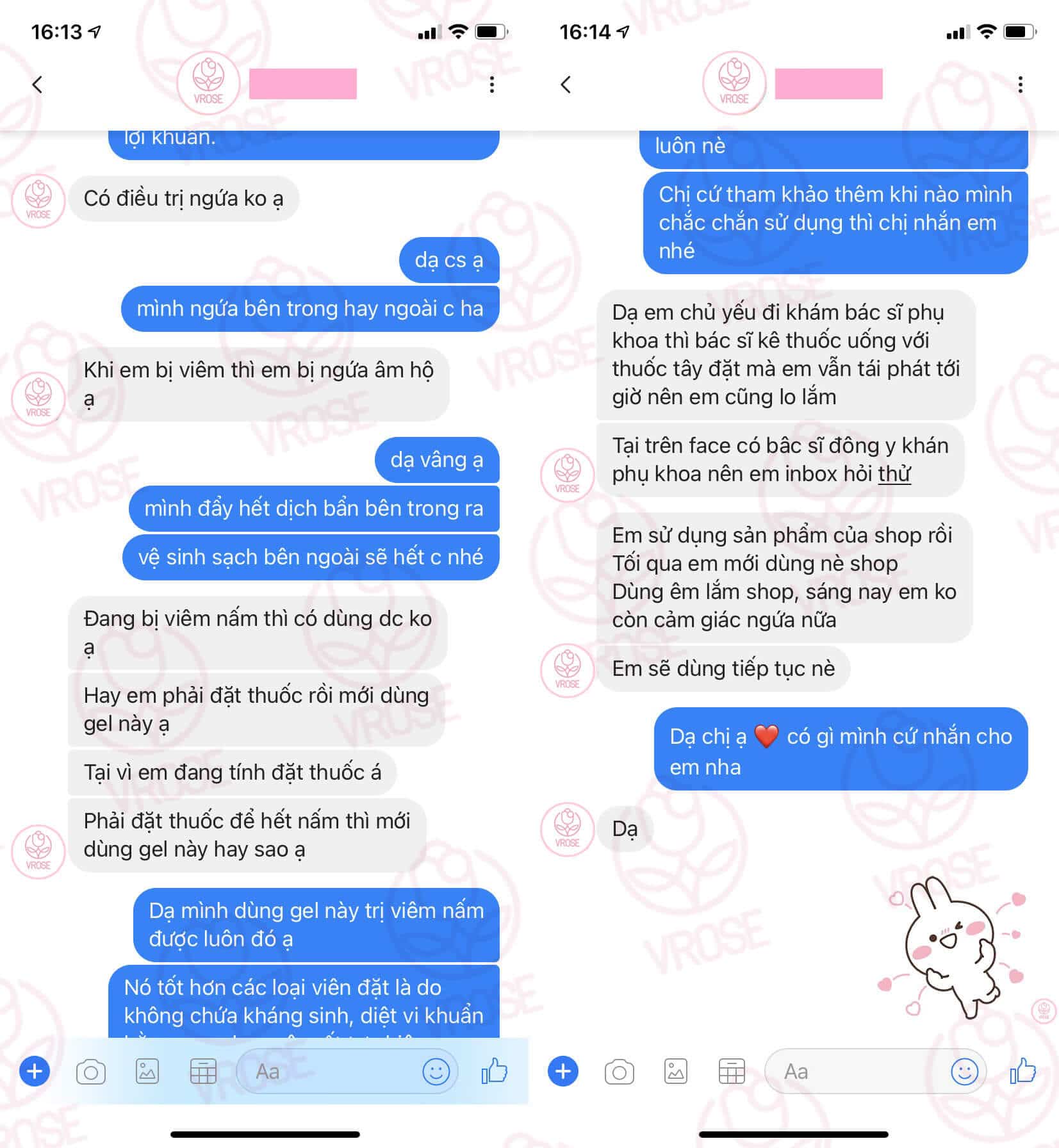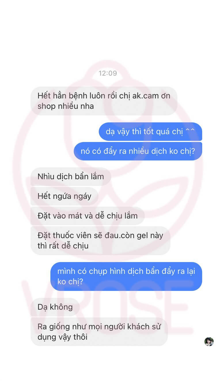 “Mình bị nấm cadida cũng lâu rồi cứ ngứa ngáy khó chịu lắm, mình cũng đã dùng nhiều loại thuốc đặt nhưng không hết. Nhưng sau khi dùng gel phụ khoa nano Vrose thì bớt ngứa hẳn. Mình dùng thấy chất bẩn ra rất nhiều, giờ hết ngứa những mình vẫn dùng thường xuyên để làm sạch”