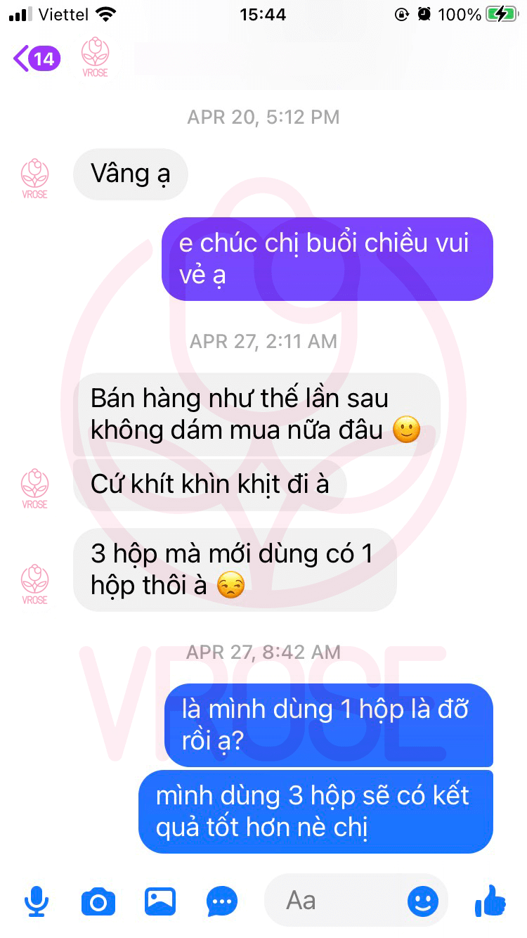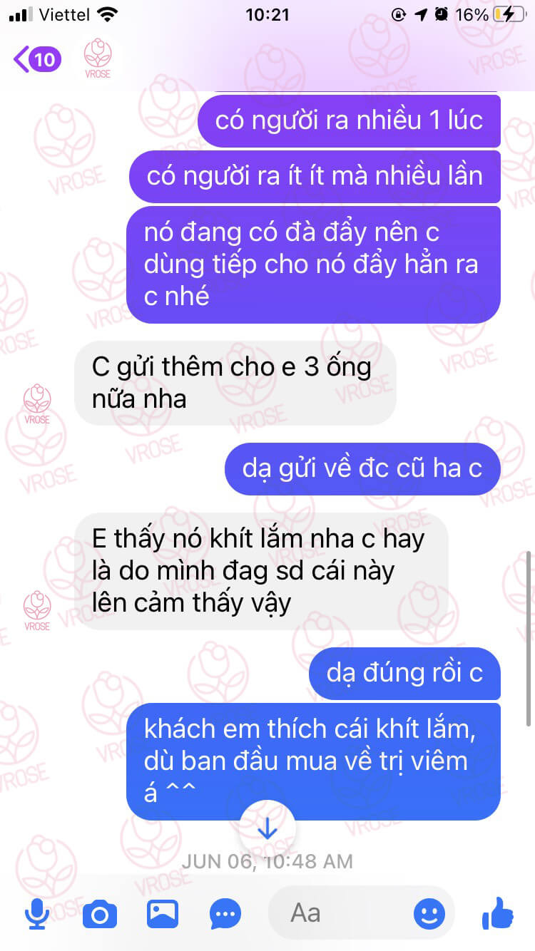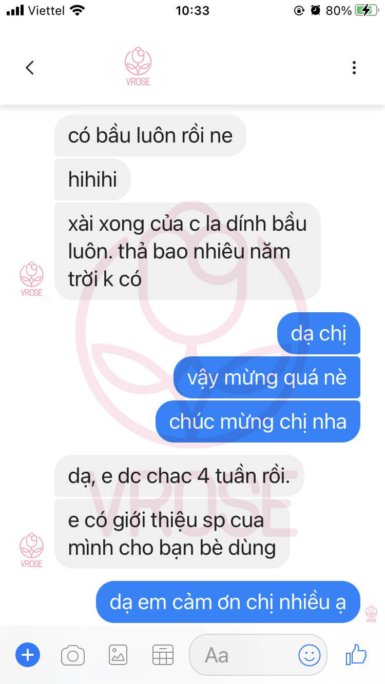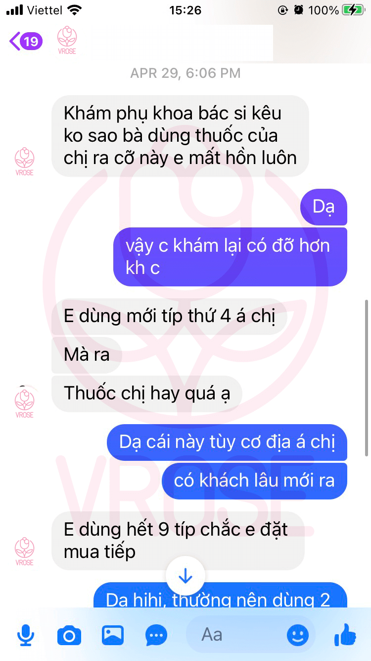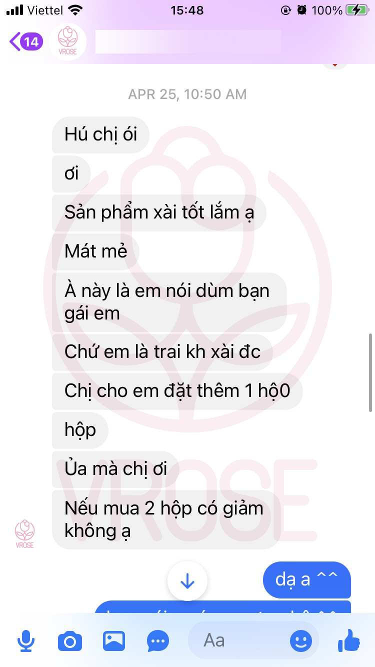 ” Do dịch covid nên 2 vợ chồng mình 3 tháng chưa gặp nhau, để tạo bất ngờ cho chồng mình thử mua nước hoa vùng kín để đổi gió phòng the. Khi gần gũi chồng bất ngờ về mùi lạ trên người mình nhưng rất thích, giờ chồng nghiện luôn cái mùi hương thoang thoảng quyến rũ này. Nhờ có nước hoa vùng kín Vrose Intimate Perfume thì chuyện yêu của vợ chồng mình ngày càng khắng khít nồng nhiệt hơn. “