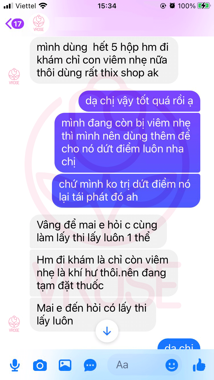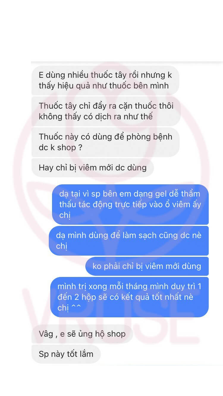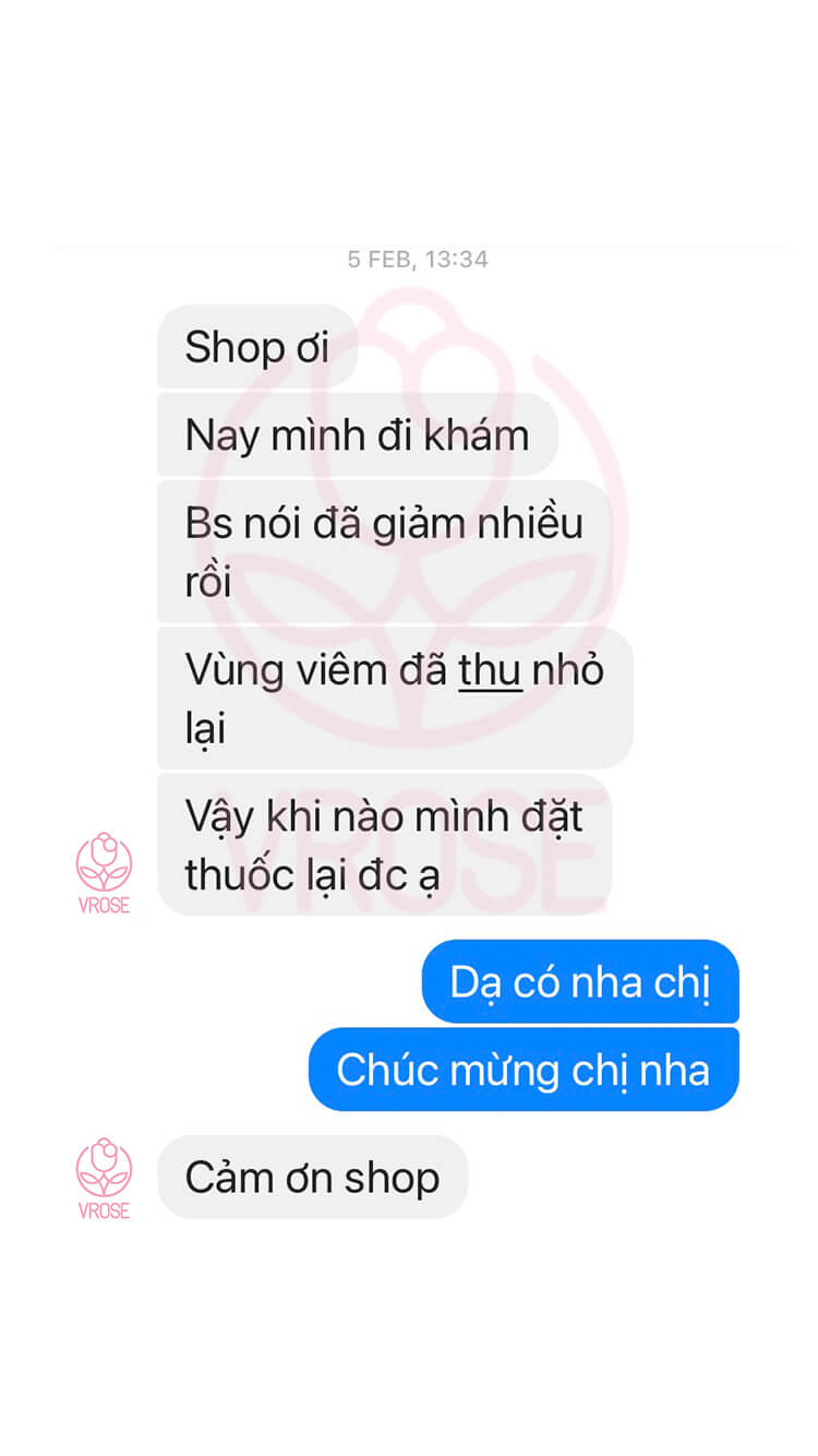 “Sản phẩm hiệu quả thật chị ơi, em bị viêm một thời gian rồi, bác sĩ kê thuốc mà cũng không khỏi, lúc đầu sử dụng sản phẩm em cũng không tin lắm. Dùng 5 hộp em đi khám lại bác sĩ bảo ổ viểm thu nhỏ lại rồi, còn hỏi dùng sản phẩm gì hay vậy nữa”