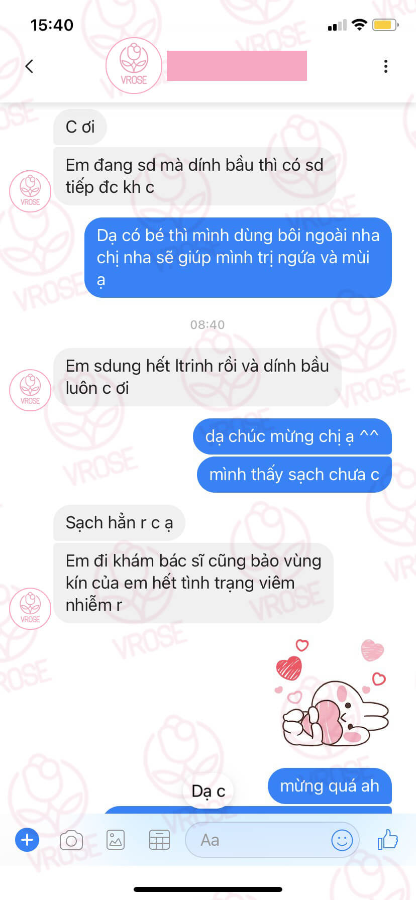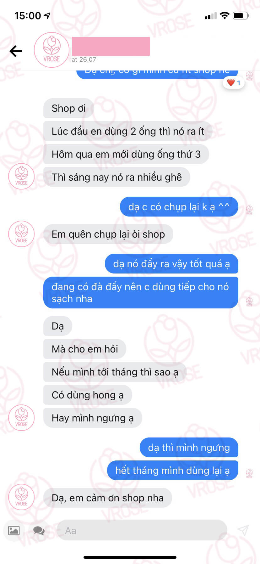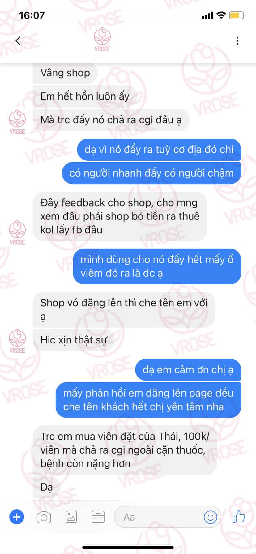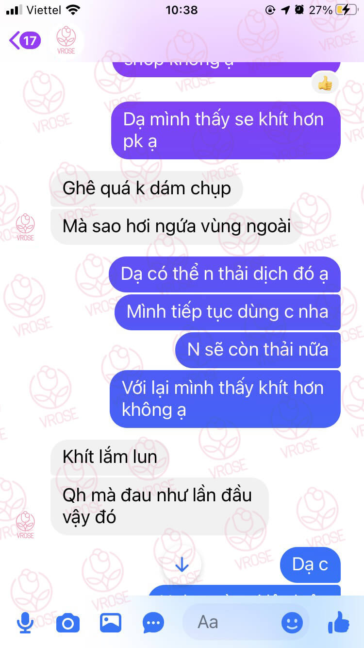 ” Mình không tin lắm vào nước hoa vùng kín, sợ dùng bị viêm nhiễm thì khổ. Nhưng từ khi mình dùng sản phẩm nước hoa vùng kín Vrose Intimate Perfume mùi có tác dụng thật. Ở Sensuel Rose có mùi thơm và sang đúng mùi ngọt ngào quyến rũ luôn á, từ khi mình dùng thì không có ảnh hưởng gì bên trong vùng kín cả. Bên cạnh đó mùi hương được lưu giữ rất lâu tầm 8-12 tiếng.”